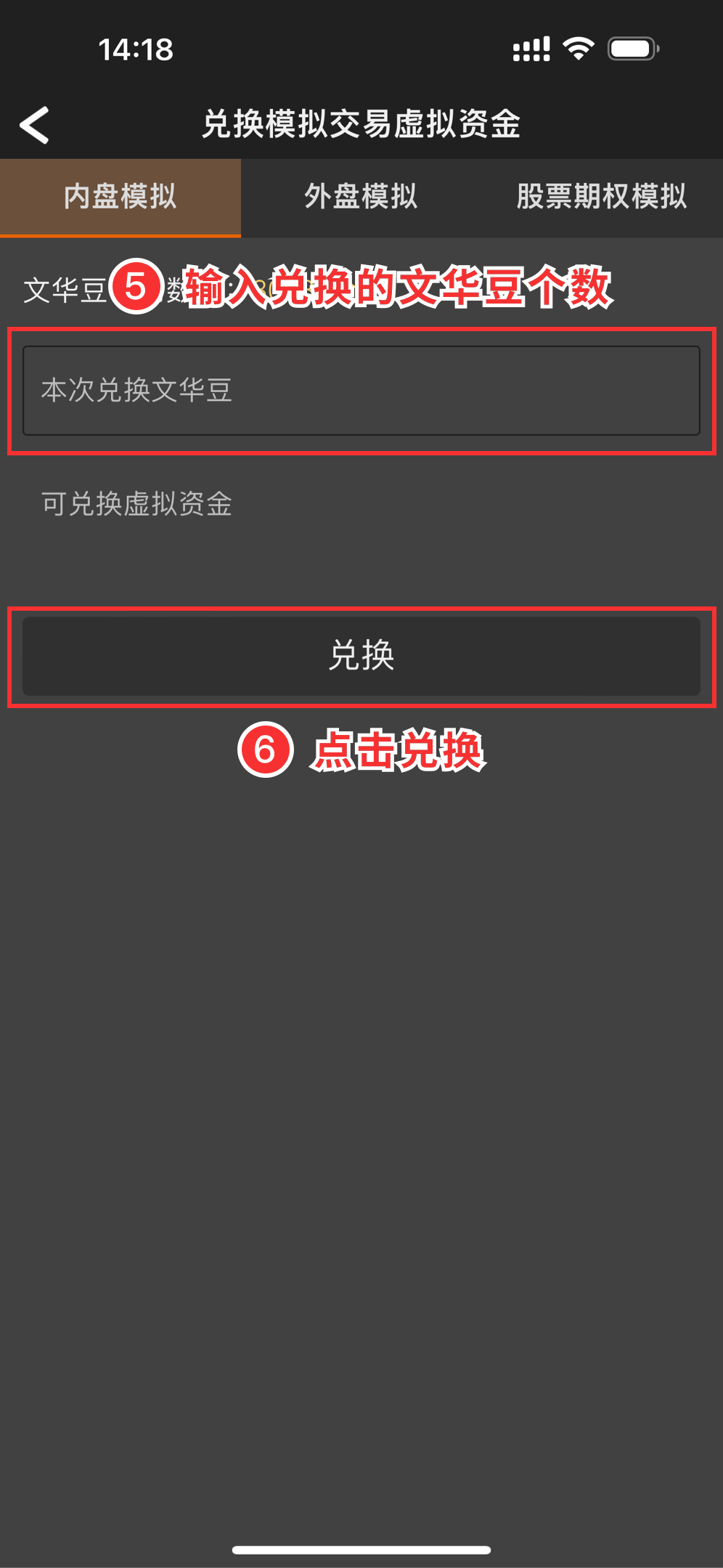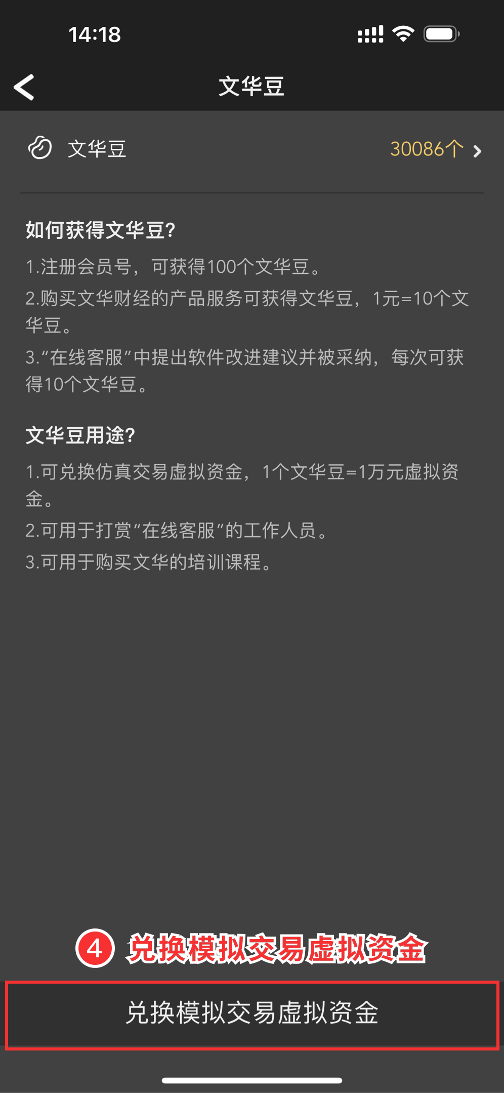 · 兑换入口路径:首页[我]->会员头像->文华豆->兑换模拟交易虚拟资金